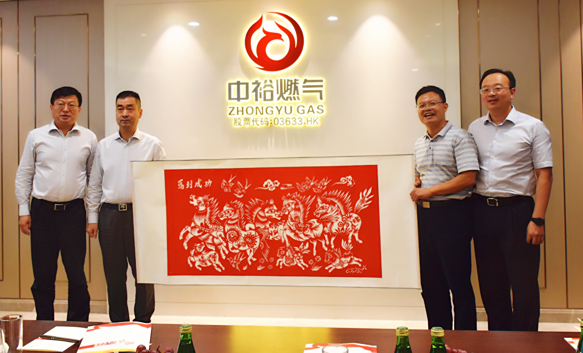 會談結(jié)束時,楊市長一行特地向中裕燃?xì)馑蜕弦环}為《馬到成功》的陜西特產(chǎn)“剪紙畫”,寓意延安市政府與中裕燃?xì)獾暮献饕矊ⅠR到成功。雙方領(lǐng)導(dǎo)本次會面為中裕燃?xì)忾_疆拓土、發(fā)展新業(yè)務(wù)提供了良好契機(jī)。